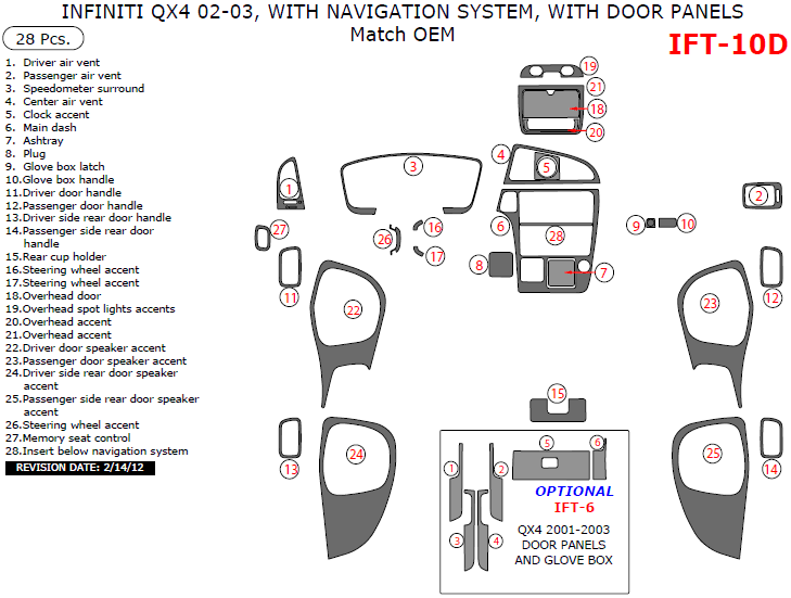 We offer a wide variety of colors and materials of Infiniti QX4 2002-2003, Interior Dash Kit, With Navigation System, With Door Panels, 28 Pcs., Match OEM. Choose your favourite option and place an order.