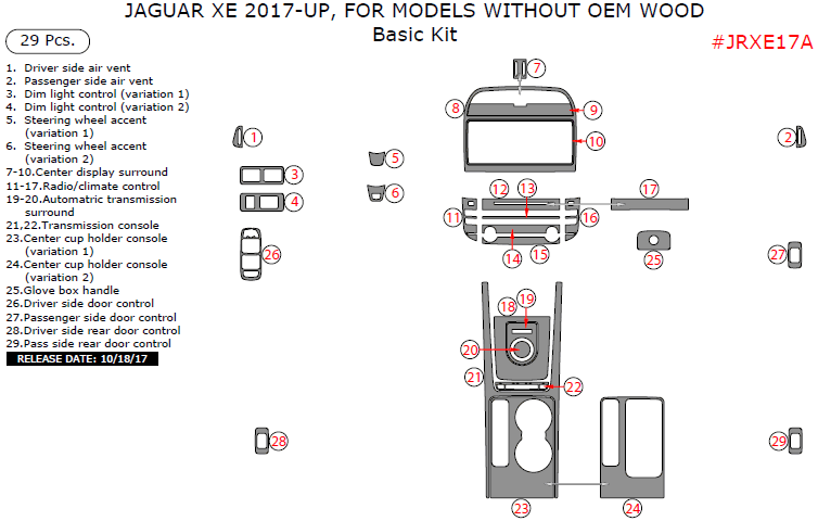 Jaguar XE 2017-2019, For Models Without OEM Wood, Basic Interior Kit, 29 Pcs.