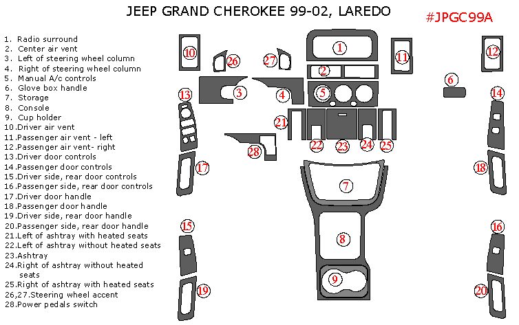 Jeep Grand Cherokee 1999, 2000, 2001, 2002, Interior Dash Kit, Laredo, Regular Or Match OEM, 28 Pcs.