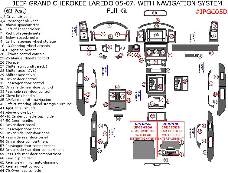 We offer a wide variety of colors and materials of Jeep Grand Cherokee 2005, 2006, 2007, Laredo With Navigation System, Full Interior Kit, 63 Pcs. Choose your favourite option and place an order.