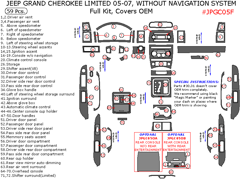 Jeep Grand Cherokee 2005, 2006, 2007, Limited Without Navigation System, Full Interior Kit, Covers OEM, 59 Pcs.