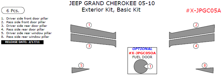 We offer a wide variety of colors and materials of Jeep Grand Cherokee 2005, 2006, 2007, 2008, 2009, 2010, Basic Exterior Kit, 6 Pcs. Choose your favourite option and place an order.