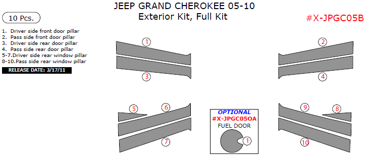 Jeep Grand Cherokee 2005, 2006, 2007, 2008, 2009, 2010, Exterior Kit, Full Interior Kit, 10 Pcs.