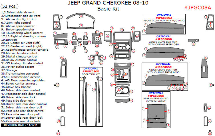 Jeep Grand Cherokee 2008, 2009, 2010, Without OEM Wood, Basic Interior Kit, 52 Pcs.
