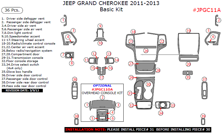 Jeep Grand Cherokee 2011, 2012, 2013, Basic Interior Kit, 36 Pcs.