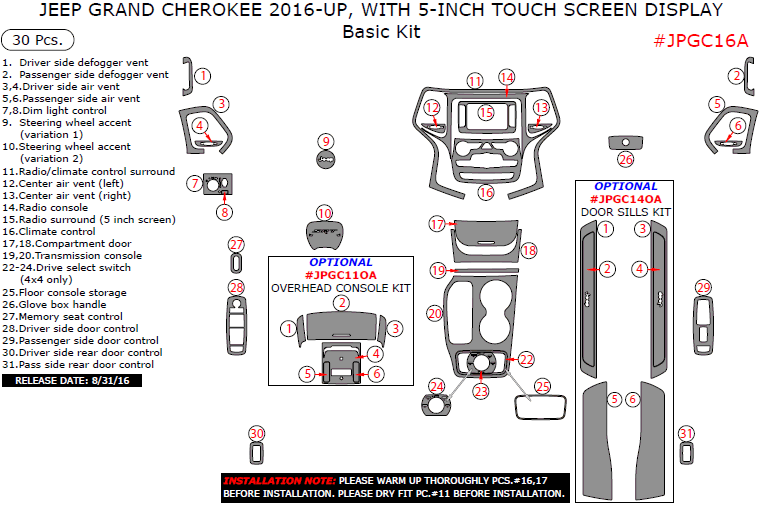 Jeep Grand Cherokee 2016, 2017, 2018, 2019, 2020, 2021 With 5 Inch Touch Screen Display, Basic Interior Kit, 30 Pcs.