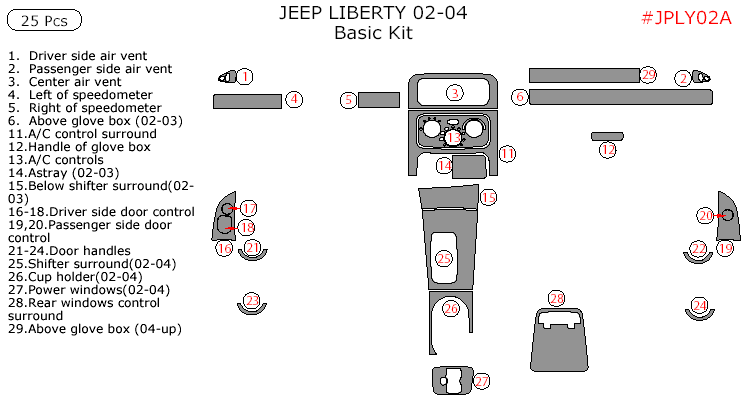 Jeep Liberty 2002, 2003, 2004, Basic Interior Kit, 25 Pcs.
