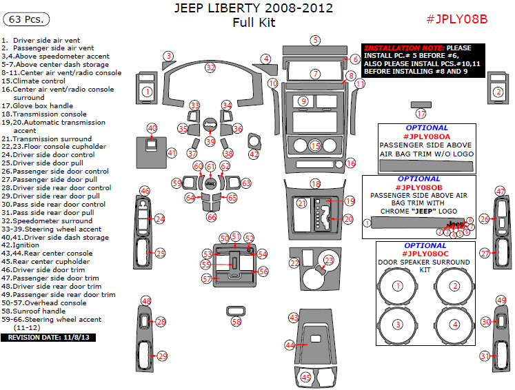 We offer a wide variety of colors and materials of Jeep Liberty 2008, 2009, 2010, 2011, 2012, Full Interior Kit, 63 Pcs. Choose your favourite option and place an order.