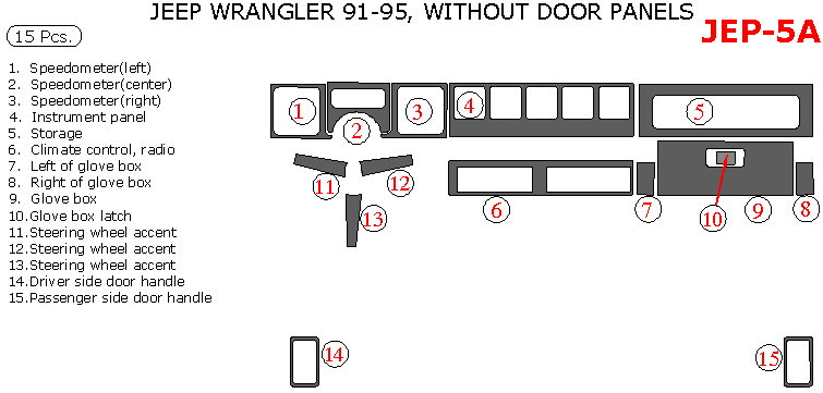 Jeep Wrangler 1991, 1992, 1993, 1994, 1995, Interior Dash Kit, Without Door Panels, 15 Pcs.