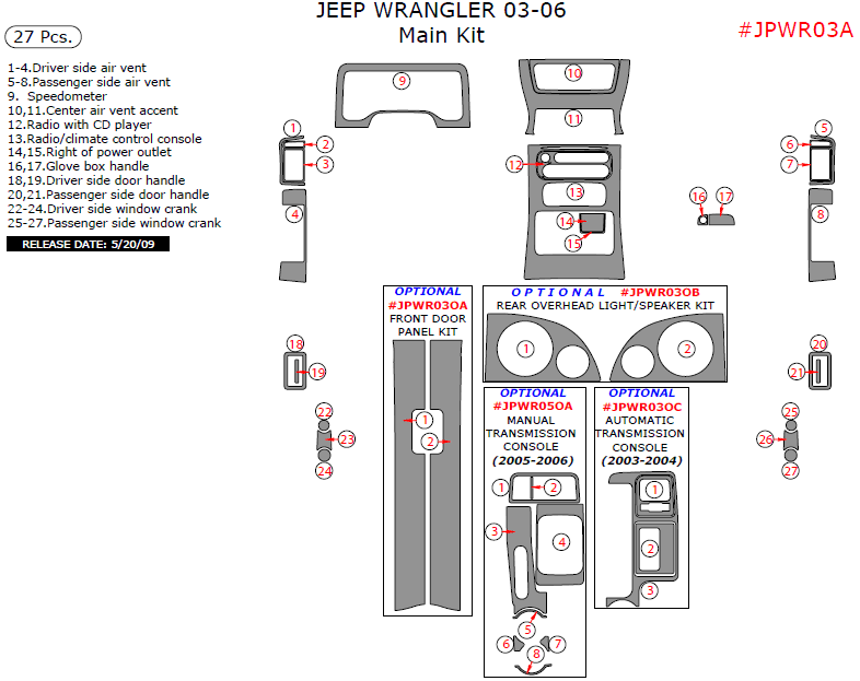 Jeep Wrangler 2003, 2004, 2005, 2006, Main Interior Kit, 27 Pcs.