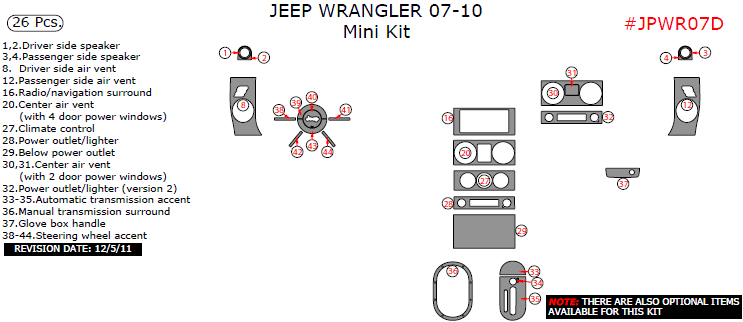 We offer a wide variety of colors and materials of Jeep Wrangler 2007, 2008, 2009, 2010, Mini Interior Kit, 26 Pcs. Choose your favourite option and place an order.