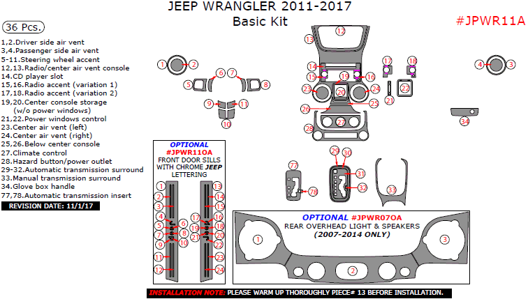We offer a wide variety of colors and materials of Jeep Wrangler 2011, 2012, 2013, 2014, 2015, 2016, 2017, Basic Interior Kit, 36 Pcs. Choose your favourite option and place an order.