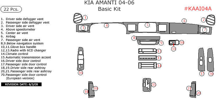 We offer a wide variety of colors and materials of Kia Amanti 2004, 2005, 2006, Basic Interior Kit, 22 Pcs., Match OEM. Choose your favourite option and place an order.
