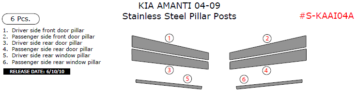 We offer a wide variety of colors and materials of Kia Amanti 2004, 2005, 2006, 2007, 2008, 2009, Stainless Steel Pillar Posts, 6 Pcs. Choose your favourite option and place an order.