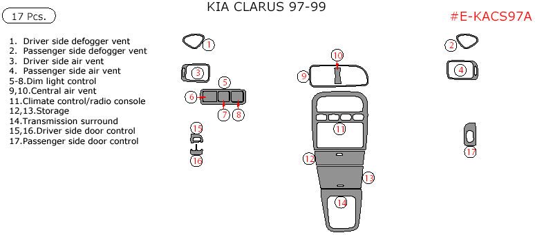 We offer a wide variety of colors and materials of Kia Clarus 1997, 1998, 1999, Interior Dash Kit, 17 Pcs. Choose your favourite option and place an order.
