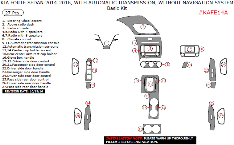 Kia Forte Sedan 2014, 2015, 2016, With Automatic Transmission, Without Navigation System, Basic Interior Kit, 27 Pcs.