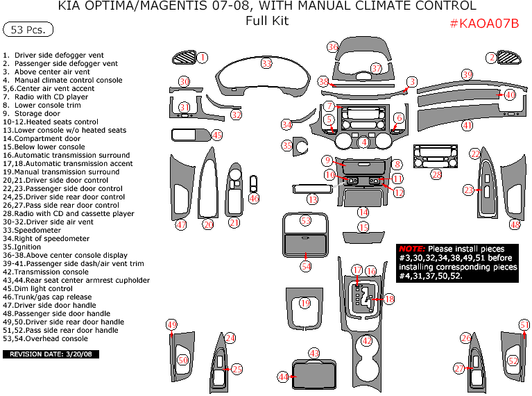 Kia Magentis/Optima 2007-2008, With Manual Climate Control, Full Interior Kit, 53 Pcs.