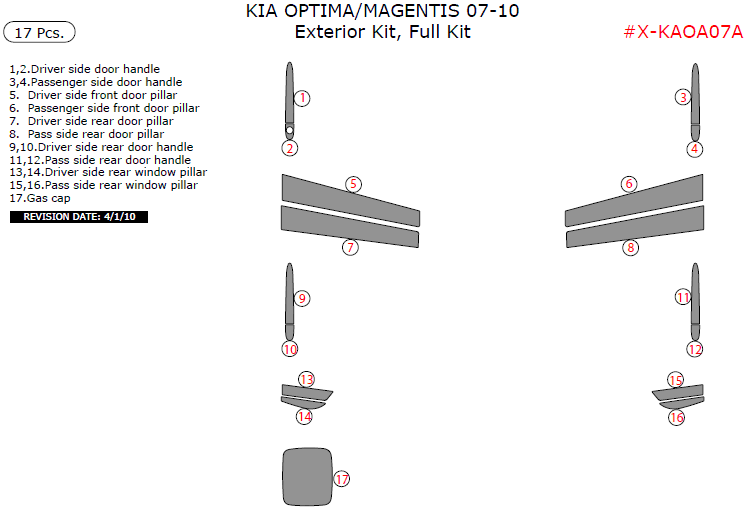 Kia Magentis/Optima 2007, 2008, 2009, 2010, Exterior Kit, Full Interior Kit, 17 Pcs.