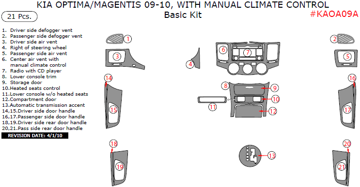 Kia Magentis/Optima 2009-2010, With Manual Climate Control, Basic Interior Kit, 21 Pcs.