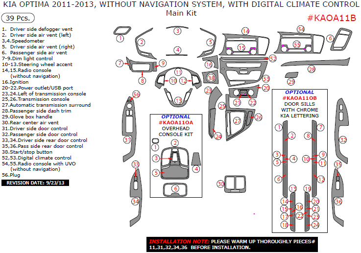 Kia Optima 2011, 2012, 2013, Without Navigation System, With Digital Climate Control, Main Interior Kit, 39 Pcs.