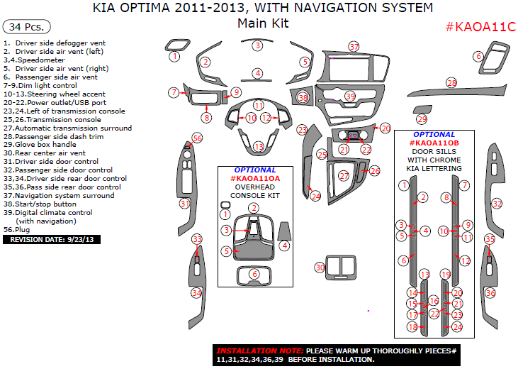 Kia Optima 2011, 2012, 2013, With Navigation System, Main Interior Kit, 34 Pcs.