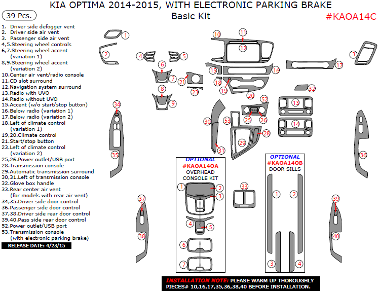 Kia Optima 2014-2015, With Electronic Parking Brake, Basic Interior Kit, 39 Pcs.