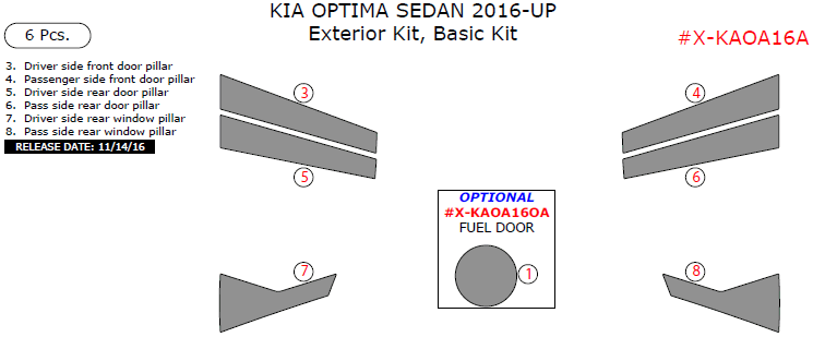 Kia Optima Sedan 2016, 2017, 2018, 2019, 2020 Basic Exterior Kit, 6 Pcs.