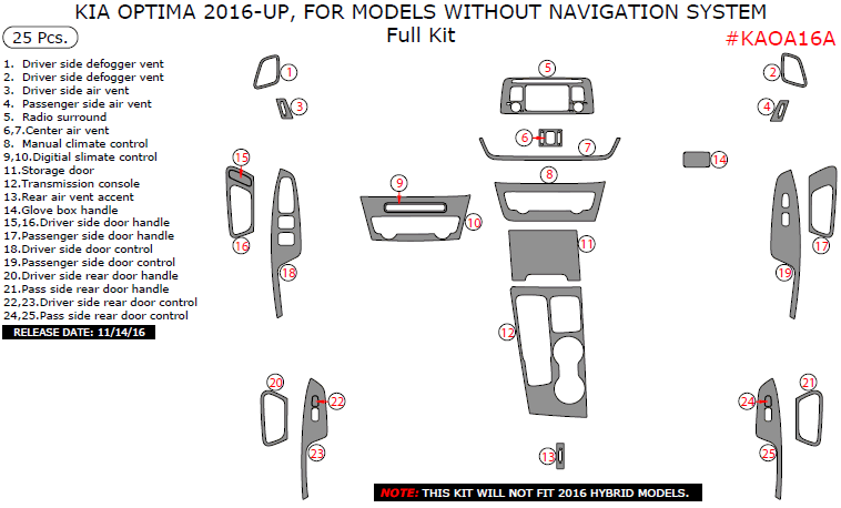 Kia Optima 2016, 2017, 2018, 2019, 2020 For Models Without Navigation System, Basic Interior Kit, 25 Pcs.