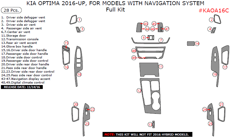 Kia Optima 2016, 2017, 2018, 2019, 2020 For Models With Navigation System, Basic Interior Kit, 28 Pcs.