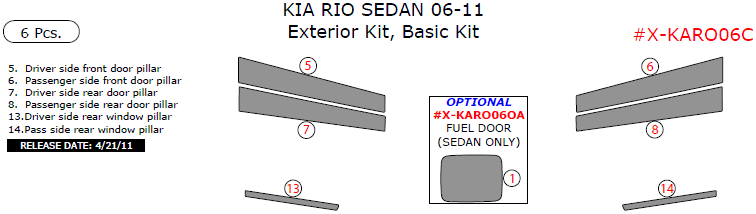 Kia Rio 2006, 2007, 2008, 2009, 2010, 2011, Basic Exterior Kit (Sedan Only), 6 Pcs.