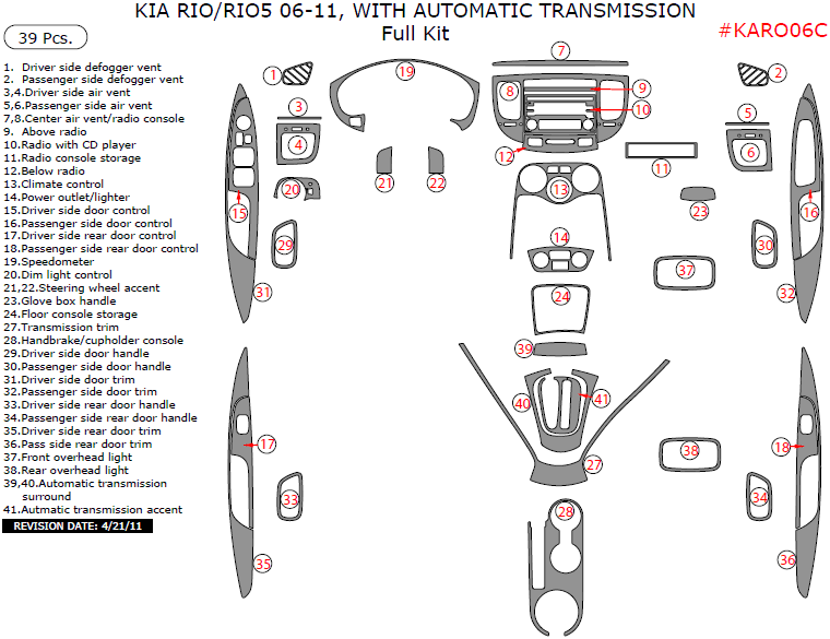 Kia Rio 2006, 2007, 2008, 2009, 2010, 2011, With Automatic Transmission, Full Interior Kit, 39 Pcs.