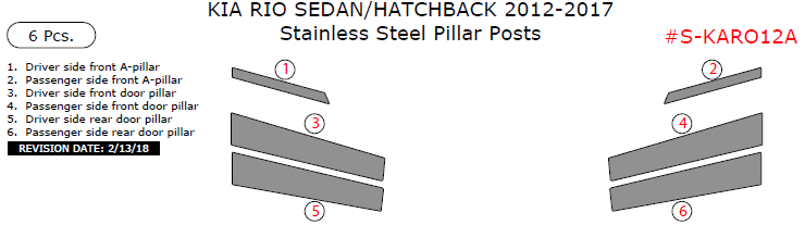 Kia Rio Sedan/Hatchback 2012, 2013, 2014, 2015, 2016, 2017, Stainless Steel Pillar Posts, 6 Pcs.