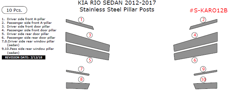 Kia Rio Sedan 2012, 2013, 2014, 2015, 2016, 2017, Stainless Steel Pillar Posts, 10 Pcs.