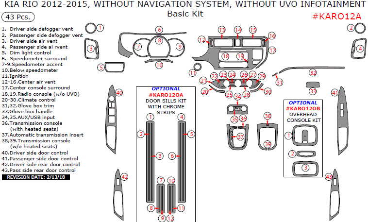 Kia Rio 2012, 2013, 2014, 2015, Without Navigation System, Without UVO Infotainment, Basic Interior Kit, 43 Pcs.