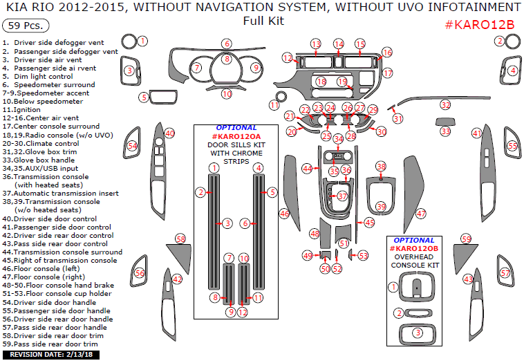 Kia Rio 2012, 2013, 2014, 2015, Without Navigation System, Without UVO Infotainment, Full Interior Kit, 59 Pcs.