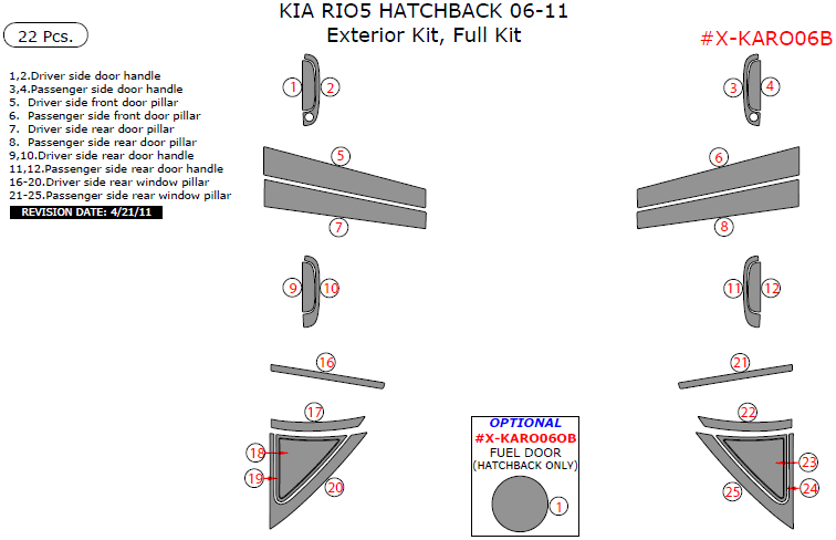 We offer a wide variety of colors and materials of Kia Rio 5 2006, 2007, 2008, 2009, 2010, 2011, Exterior Kit, Full Kit (Hatchback Only), 22 Pcs. Choose your favourite option and place an order.