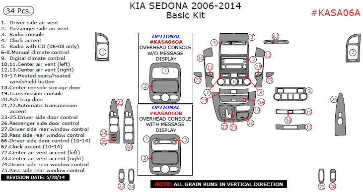 We offer a wide variety of colors and materials of Kia Sedona 2006, 2007, 2008, 2009, 2010, 2011, 2012, 2013, 2014, Basic Interior Kit, 34 Pcs. Choose your favourite option and place an order.