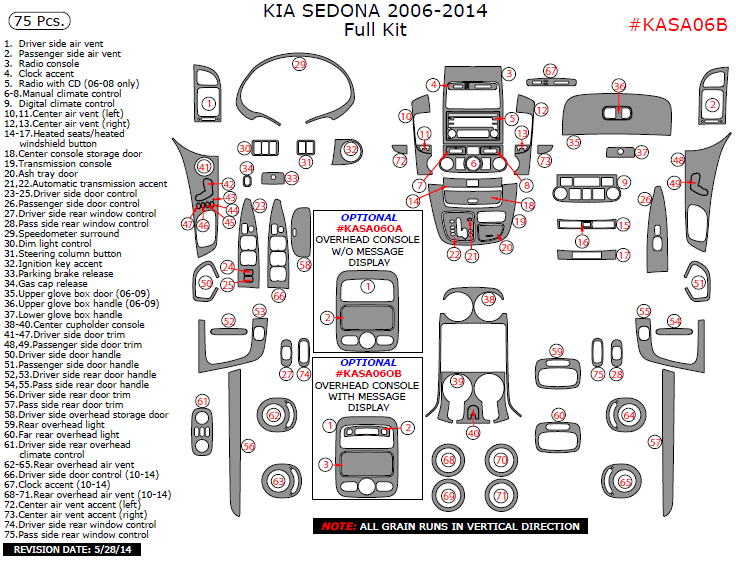 We offer a wide variety of colors and materials of Kia Sedona 2006, 2007, 2008, 2009, 2010, 2011, 2012, 2013, 2014, Full Interior Kit, 75 Pcs. Choose your favourite option and place an order.