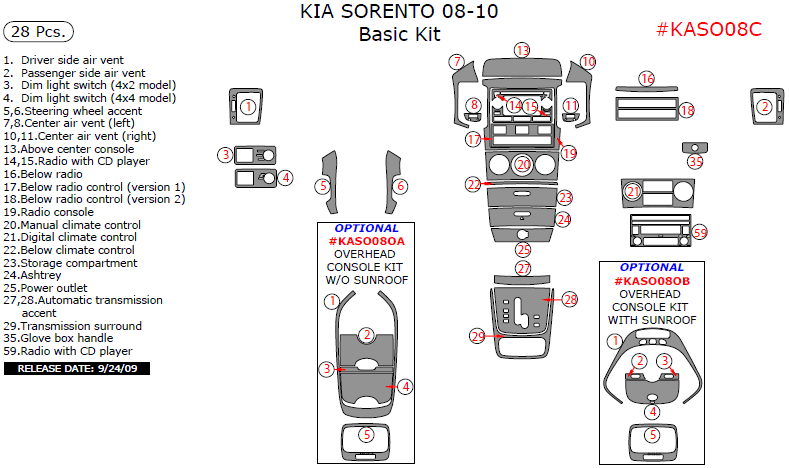 Kia Sorento 2008, 2009, 2010, Basic Interior Kit, 28 Pcs.