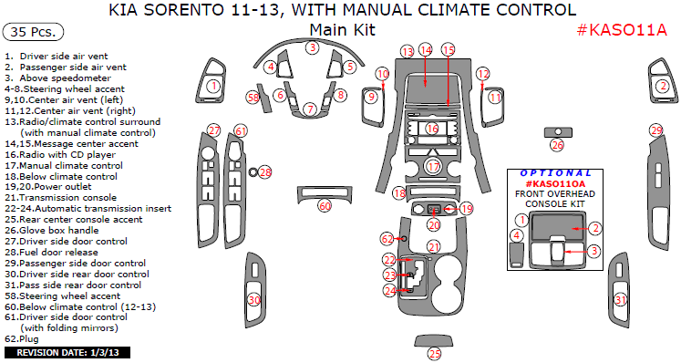 Kia Sorento 2011, 2012, 2013, With Manual Climate Control, Main Interior Kit, 35 Pcs.