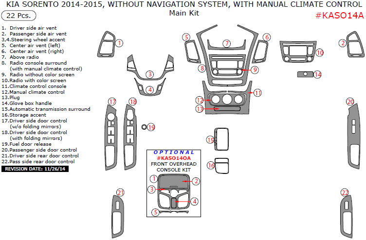 Kia Sorento 2014-2015, Without Navigation System, With Manual Climate Control, Main Interior Kit, 22 Pcs.