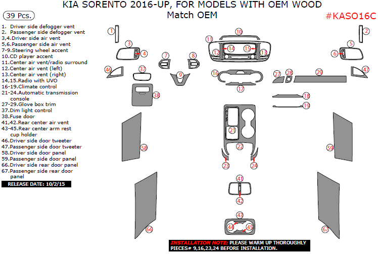 Kia Sorento 2016, 2017, 2018, 2019, 2020, Interior Dash Kit, For Model With OEM Wood, 39 Pcs., Match OEM