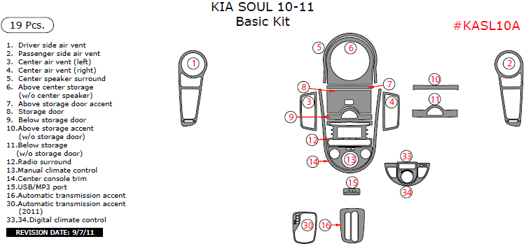 Kia Soul 2010-2011, Basic Interior Kit, 19 Pcs.