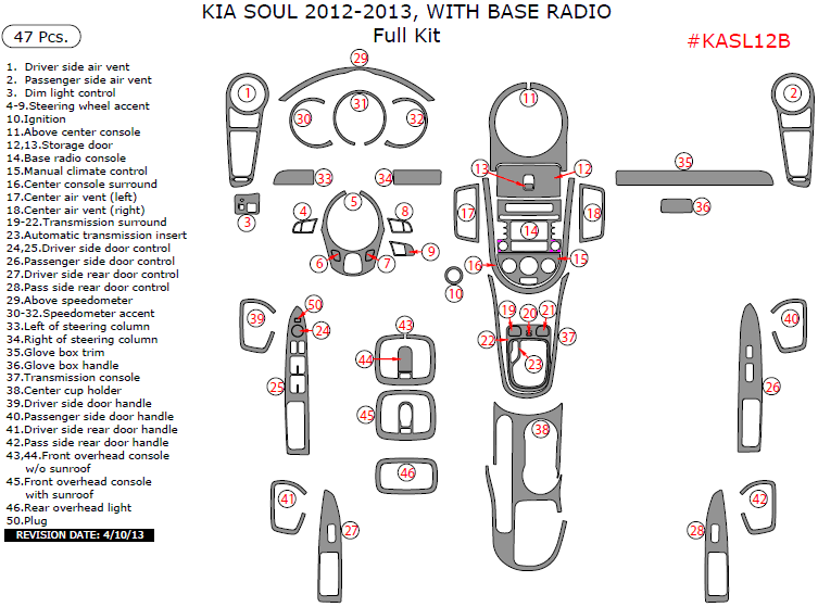 Kia Soul 2012-2013, With Base Radio, Full Interior Kit, 47 Pcs.