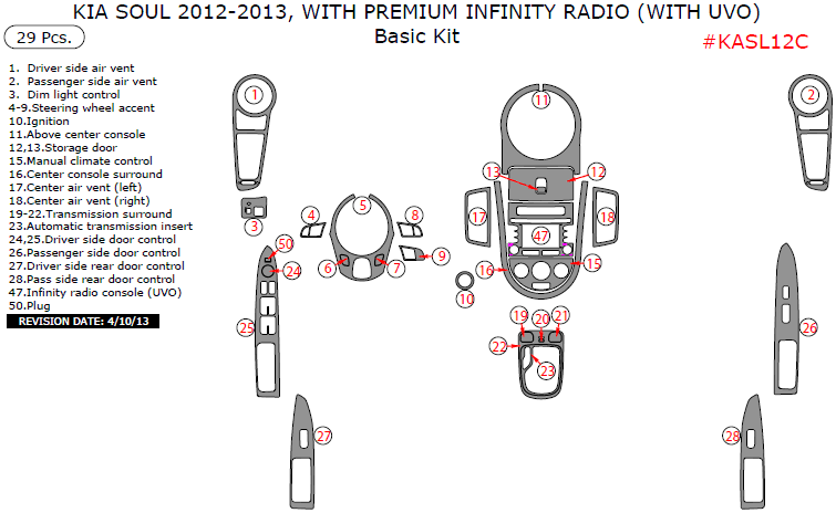 Kia Soul 2012-2013, With Premium Infinity Radio (With UVO), Basic Interior Kit, 29 Pcs.