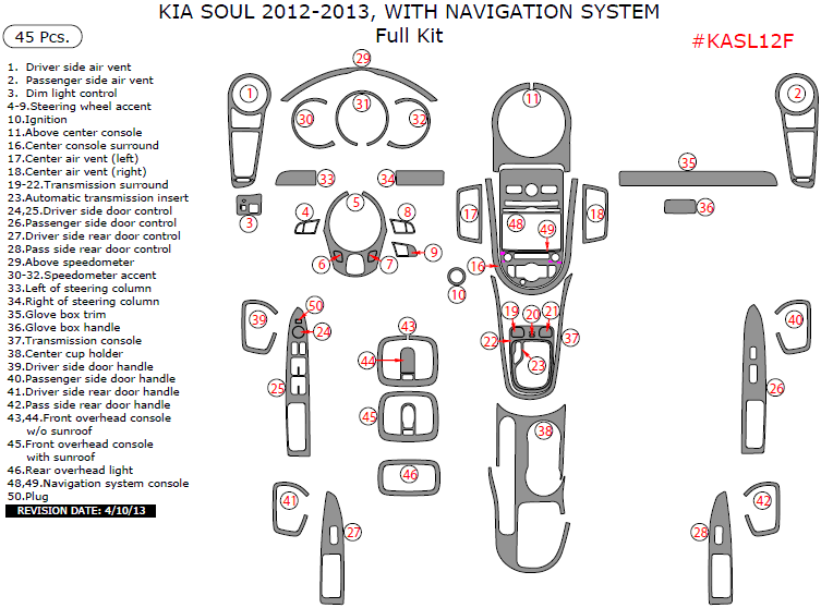 Kia Soul 2012-2013, With Navigation System, Full Interior Kit, 45 Pcs.