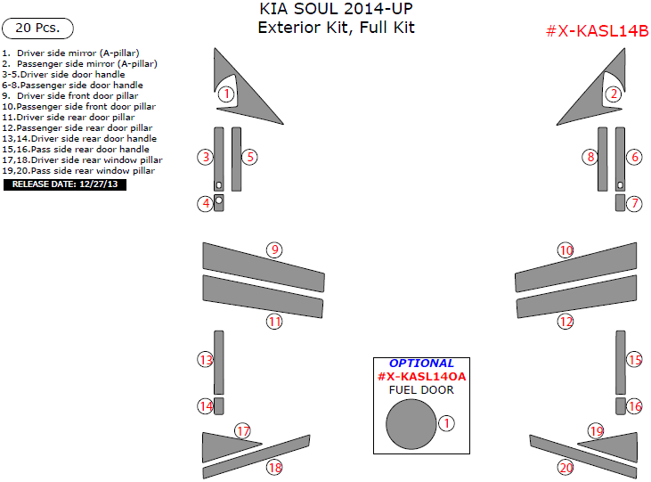 Kia Soul 2014, 2015, 2016, 2017, 2018, 2019, Exterior Kit, Full Interior Kit, 20 Pcs.