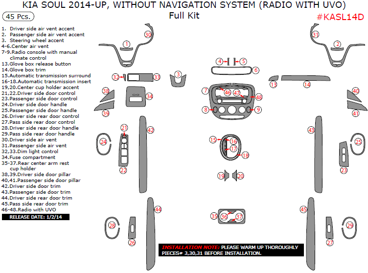 Kia Soul 2014, 2015, 2016, 2017, 2018, 2019, Without Navigation System (Radio With UVO), Full Interior Kit, 45 Pcs.