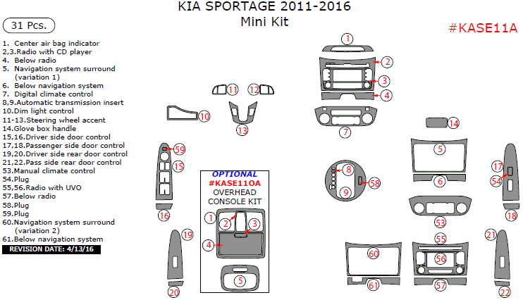 Kia Sportage 2011, 2012, 2013, 2014, 2015, 2016, Mini Interior Kit, 31 Pcs.
