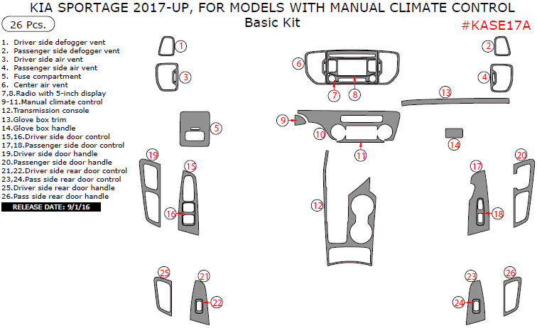 Kia Sportage 2017-2019, For Models With Manual Climate Control, Basic Interior Kit, 26 Pcs.